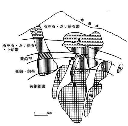 時に,錫,タングステン,モリブデン,銅,鉛・亜鉛鉱石など深~浅熱水性鉱脈すべての性格を備えた鉱脈があり,これをゼノサーマル型鉱脈という。