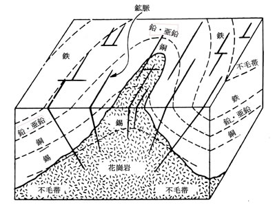 帯状分布はまた鉱山や地域の鉱脈群について水平的,立体的な広がりとして認められる場合がある。たとえば,英国コンウォール地方では花こう岩貫入岩から離れるにつれて,錫帯,銅帯,亜鉛帯,鉄帯の順に帯状分布が見られる(下図参照)。