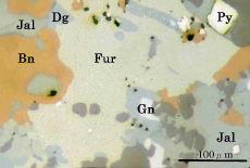 鉱石は大黒沢東鉱体(-2mレベル,西 1.5, 北 3.25)の層状黒鉱の最上部から産した斑銅鉱質黒鉱で主に輝銀銅鉱,斑銅鉱,方鉛鉱,閃亜鉛鉱,方鉛鉱,黄銅鉱,重晶石などからなる。