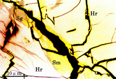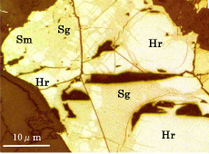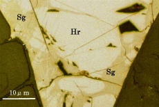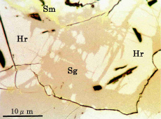 これらの3鉱物は,密雑に組み合って,かんらん岩(レールゾライト)のかんらん石,単斜輝石,斜方輝石の粒間を充填して,顕微鏡下でのみ認められる。
