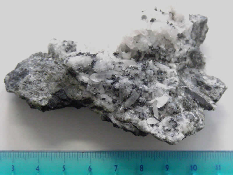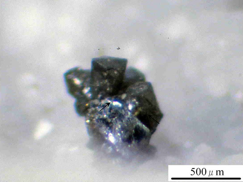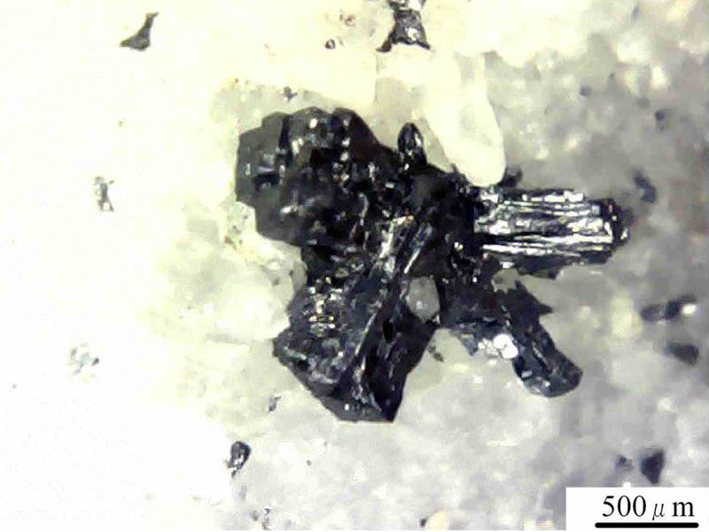 石英晶洞中に上記の鉱物と供に0.5~1mm大の短柱状の銀灰色で,金属光沢を有する自形結晶として産する。普通双晶をなしている。