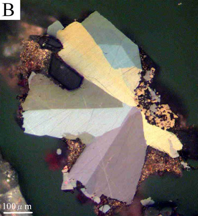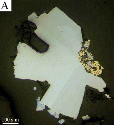 バウムスターク鉱は反射顕微鏡下で明るい青味を帯びた灰色から明るい褐色味をおびた白色に変化する中程度の多色性を呈し(下図A),異方性は非常に強く黄褐色から青灰色まで変化する(下図B)。