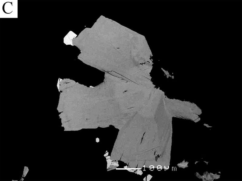 反射電子線像(図C)では鉱物内に若干の濃淡が認められるが,これはAsの含有量の違いに基づくものである。