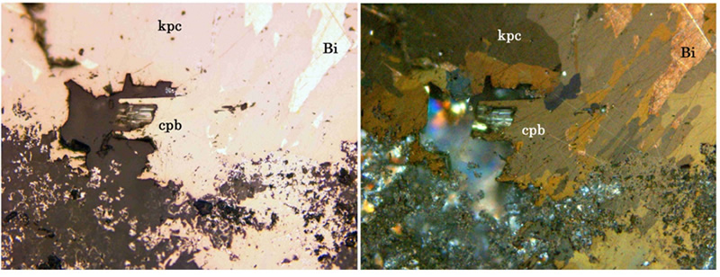 これら三者の反射顕微鏡下での識別は非常に難しいが,kupcikiteはcuprobismutiteに比し,僅かにピンク色味を帯びている。(下図参照)