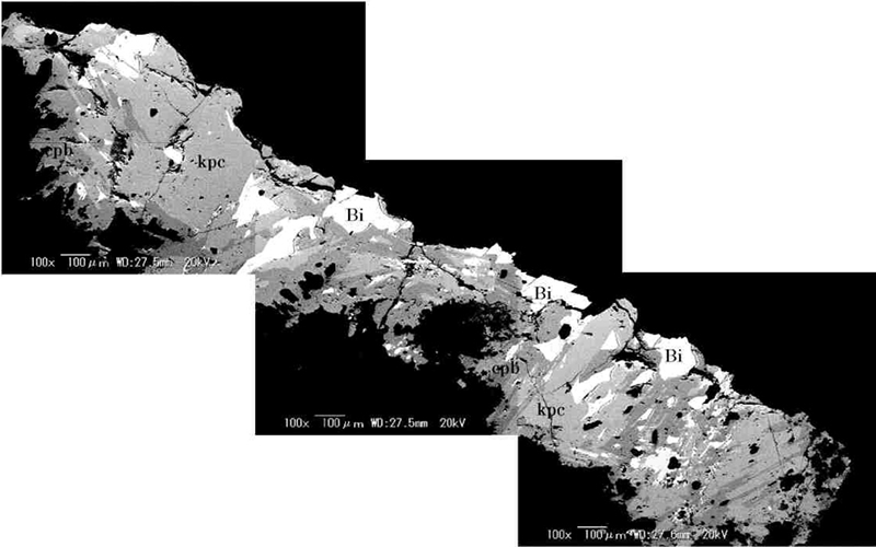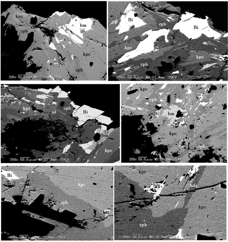 普通kupcikiteは粒状結晶の集合であるが,cuprobismutiteはkupcikiteの一部を交代しており,それを被覆するように晶出している。しばしば短柱状の自形結晶を呈している。Hodrushiteはkupcikiteを交代して,少量認められる。