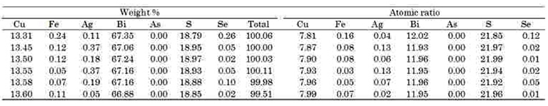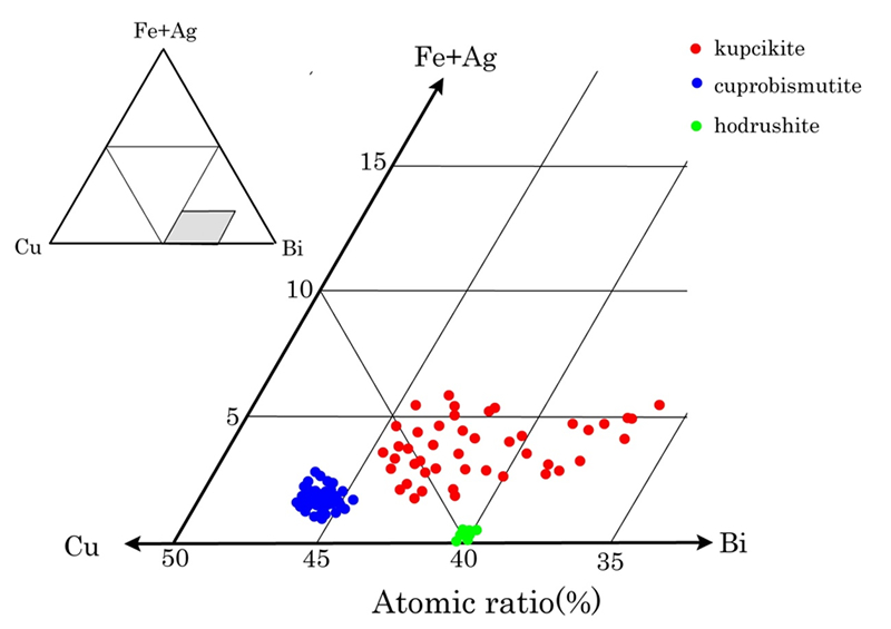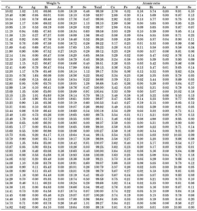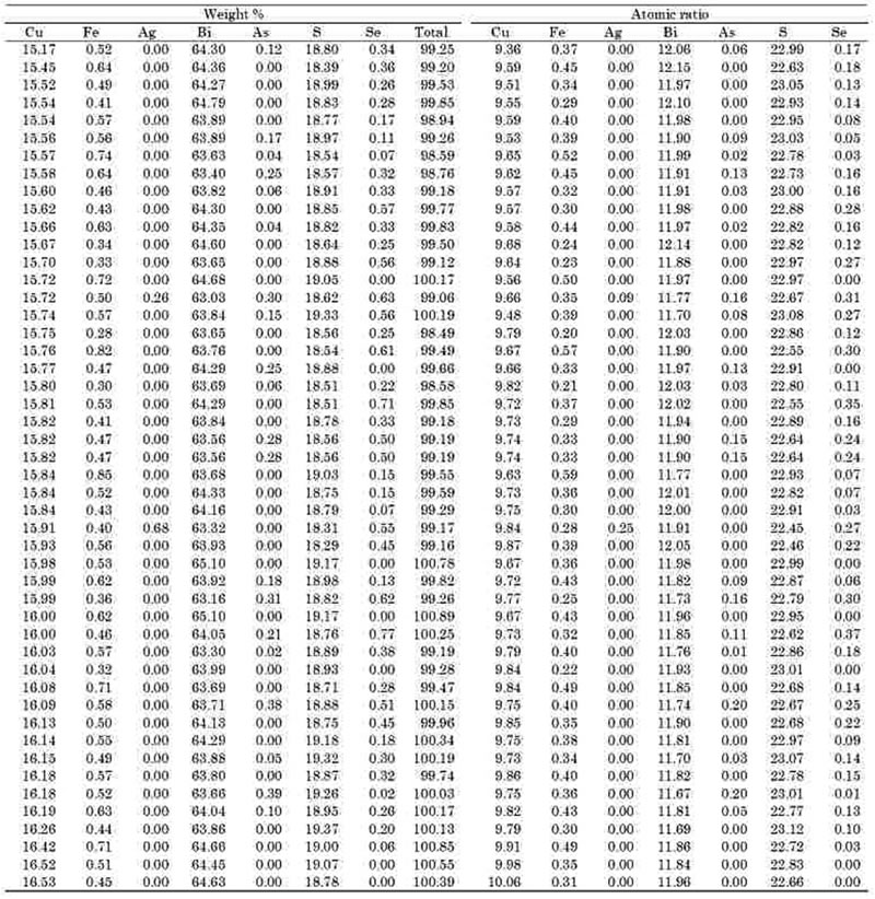 またkupcikiteのCu:Bi比は変化し,固溶体を形成しているが,平均値はCu3.51(Fe0.29Ag0.05)0.34(Bi5.42,As0.01)5.43(S9.98,Se0.12)10.10と理想式Cu3.4Fe0.6Bi5S10に近い。