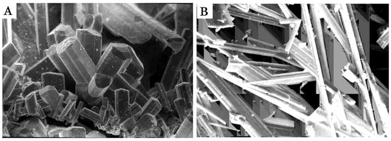 天然において上記kupcikiteの自形結晶はまだ見出されていないが,熱水合成実験(Sugaki et al., 1980)では自形結晶が得られている。下図に熱水合成で合成したkupcikiteの結晶とcuprobismutiteの結晶を比較して掲げている。