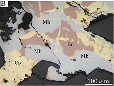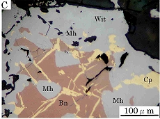 三原鉱は普通黄銅鉱葉片を持つ斑銅鉱と密接に組み合って産する(下図A,B)。しばしはウィチヘン鉱を伴う(下図C)。