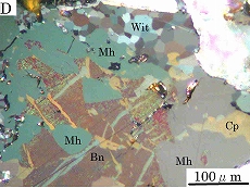 三原鉱とウィチヘン鉱とは平行ニコル下ではほとんど識別できないが,注意深く見ればウィチヘン鉱の方がわずかに明るい(C)。直交ニコル下ではウィチヘン鉱の方が異方性が強く,細かい結晶粒の集合であることがわかるり,比較的容易に識別できる(D)。