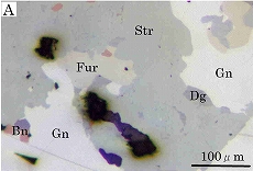 研究に用いた鉱石試料(#03066,#03067)は第11鉱体480号鉱体325mLで産出した斑銅鉱質黒鉱で,肉眼的に閃亜鉛鉱,方鉛鉱,黄銅鉱,黄鉄鉱,四面砒銅鉱および斑銅鉱が認められる。