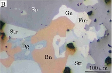 古遠部鉱は鏡下のみで認められ,50~100μm大の不規則な粒状として輝銀銅鉱や方輝銅鉱を密接に伴って産し,方鉛鉱(A, #03066)や斑銅鉱,閃亜鉛鉱,方輝銅鉱(B, #03067)と緻密・複雑に組み合う。 釈迦内,古遠部,ErasmusおよびTsumeb各鉱山産古遠部鉱のEPMA分析値の平均値を下表に掲げている。