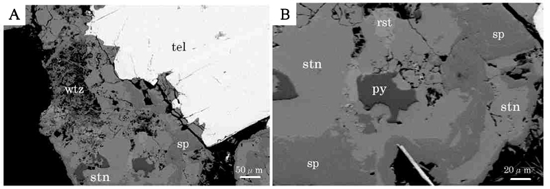 黄錫鉱は閃亜鉛鉱,黄鉄鉱,繊維亜鉛鉱や黄銅鉱と組み合って、ティール鉱に随伴して産する(下図A)。また,赤錫鉱は黄錫鉱中に粒状を呈して含まれ,少量認められた(下図B)。両者の識別は反射顕微鏡下では比較的難しい。また赤錫鉱の鏡下での性質は元記載とは若干異なるが,化学組成はほとんど変わらないので,ここでは赤錫鉱とした。
