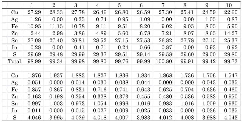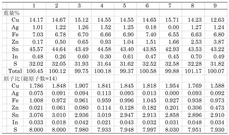 これらの分析値の平均は(Cu1.83Ag0.05)1.88(Fe0.98Zn0.22)1.20(Sn2.91In0.04)2.95S7.98と理想式Cu2FeSn3S8に近い。 微量のInを含んでおり,林・苣木(1986)の値に近いが,今回得られたZn含有量は0.17~3.87重量%と若干変化している。