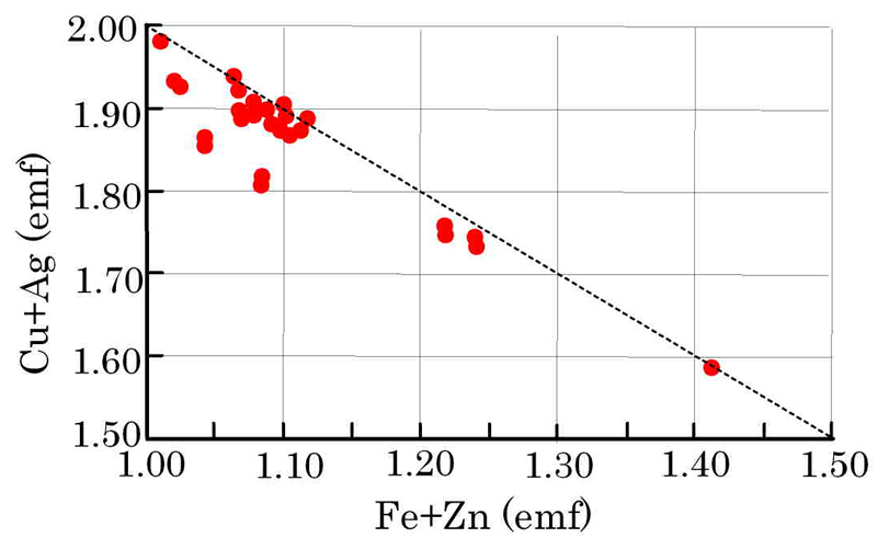 この鉱物の組成は分析場所により著しくCu, Fe, Zn量が変化しているが累帯構造は認められない。(Cu+Ag)vs(Fe+Zn)の関係は下図のようで,(Cu+Ag)と(Fe,Zn)との置換関係が認められ、黄錫鉱の置換関係(Cuは一定で,FeとZnとの置換)とは異なり,別種の鉱物とも考えられる。