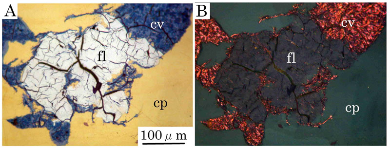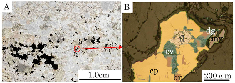 フレッチャー鉱(fl)は上記のような銅硫化鉱物のうち普通粒状を呈して黄銅鉱に包有されて認められた(B)。時には斑銅鉱とも共生する。斑銅鉱は二次的に銅藍(cv)により交代され,その境界部に方輝銅鉱(dg)が認められる。