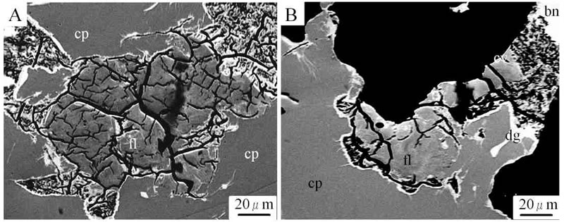 フレッチャー鉱を含む部分の反射電子線(BSE)像は下図A,Bのようで,フレッシャー鉱(fl)と黄銅鉱(cp)との区別は比較的難しい。BSE像では鏡下で均質に見えたフレッチャー鉱に僅かに濃淡が見られ,若干組成差があると予想される(B)。