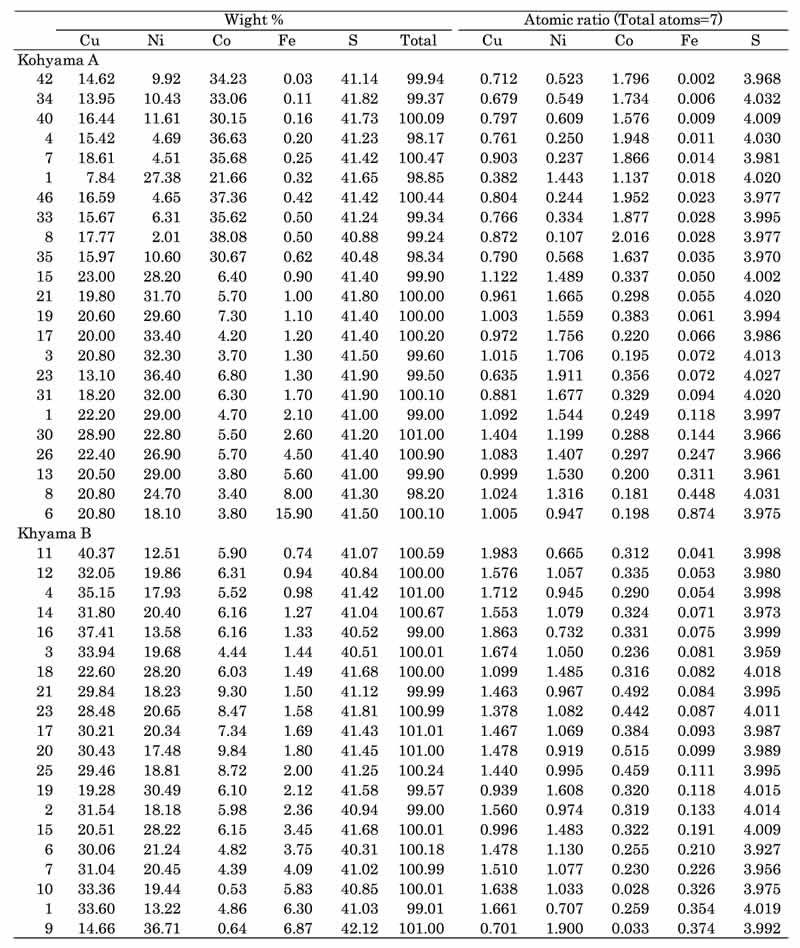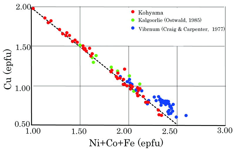 高山産フレッチャー鉱のCu:(Ni+Co+Fe)比は下図のようで,図には比較のため元記載のVibrnum(Craig & Carpenter,1977)とKalgoorlie(Oswald,1985)産フレッチャー鉱のデータを示している。全体的に見てCu⇔Ni+Co+Feの置換が認められる。Cuの値は2.0~0.5迄変化し,フレッチャー鉱の組成式はCu2-x(Ni,Co,Fe)1+xS4(x=0-1.5)で表される。
