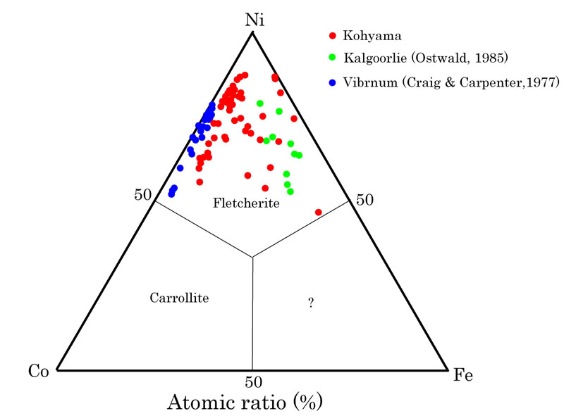 Ni:Co:Fe比を示せば下図の様で、ほとんどの分析値はNiに富むフレッチャー鉱の領域にプロットされる。上図と同じ文献の値も比較のために掲げている。
