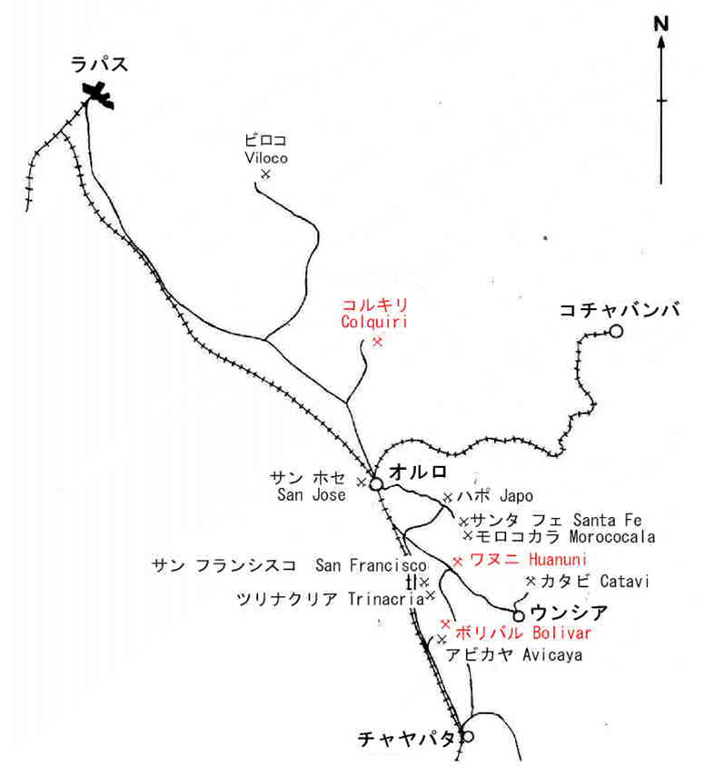 オルロ地域では右図に示す鉱山を調査した。これらの鉱山の内コルキリ,ワヌニおよびボリバル鉱山は現在も稼行中であるが,他の鉱山は既に閉山している。