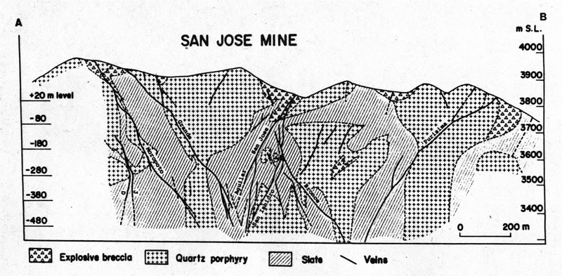 サン ホセ鉱山付近の地質断面図
