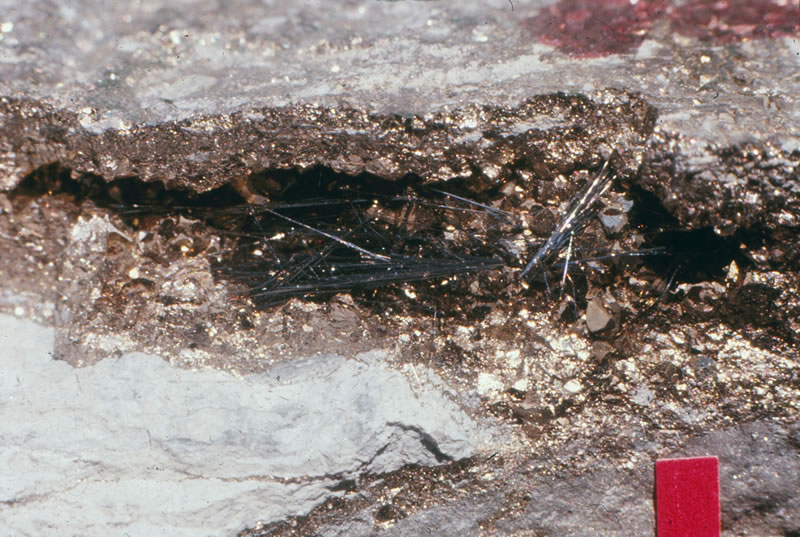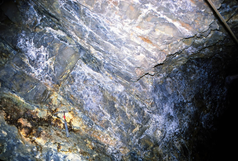サン・フランシスコ鉱山の石英・黄鉄鉱・毛鉱鉱脈(ファージャ脈,サンフランシスコ レベル,海抜:3,825m)