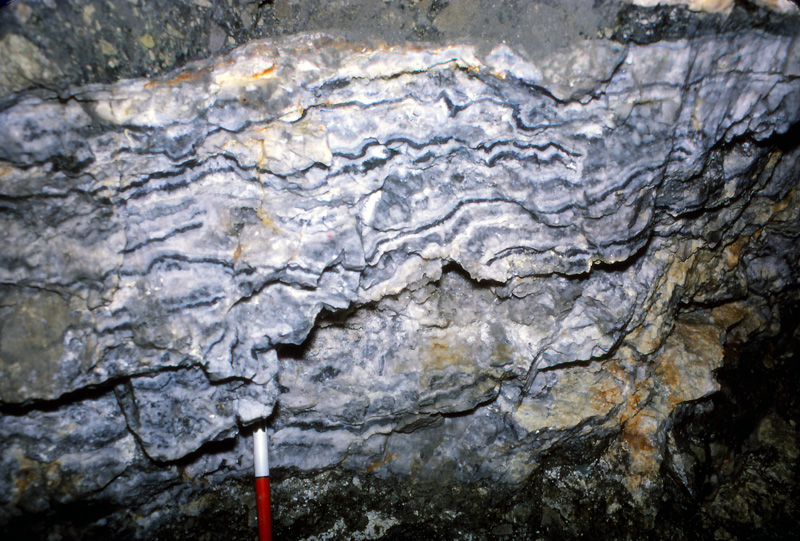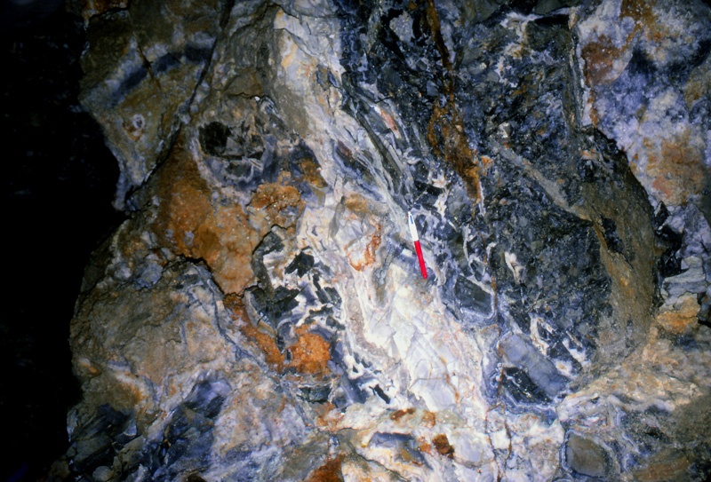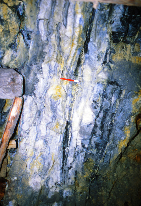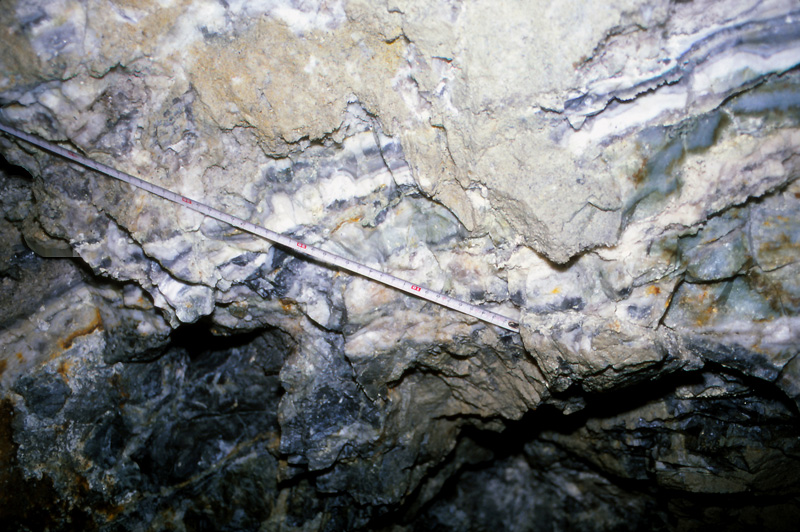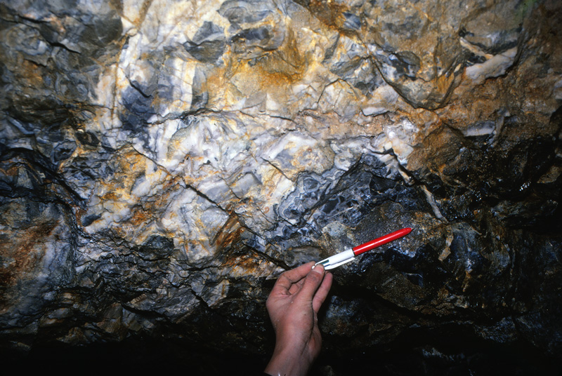珊瑠鉱山は北海道上川郡下川町字珊瑠に位置する浅熱水性金銀鉱脈鉱床で、主にエレクトラム、ナウマン鉱、濃紅銀鉱、含銀四面銅鉱などの銀鉱物を含む石英脈である(苣木他、1982)。鉱脈はいくつか知られていたが、主に本𨫤、十字𨫤が採掘されていた。特に本𨫤は累被縞状組織が発達しており、鉱脈の幅広い場所では10数mにも及ぶ。