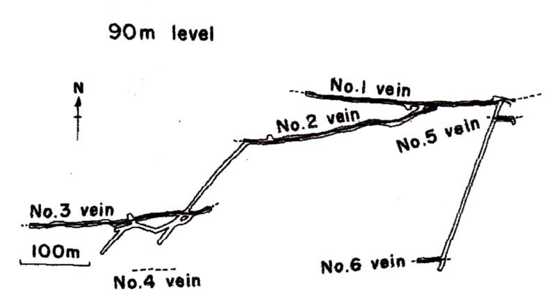 光竜鉱山の鉱脈としては1号~6号までの鉱脈が知られていたが、主として一号、二号および三号脈が採掘されていた。通道坑(90mL)における鉱脈の分布は下図のようであるが、鉱山の下部では一号脈と二号脈とが合体しており、二号脈は一号脈の分岐脈とも考えられていた。