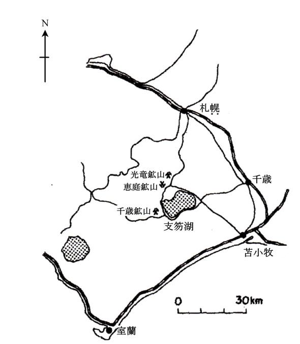 光竜鉱山は北海道恵庭市盤尻(下図参照)に位置する浅熱水性金銀鉱脈鉱床(苣木他、1984)で、一号脈産の氷長石のK-Ar年代測定により1.0Maと非常に若い生成年代とされている(苣木・磯部, 1985)。