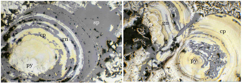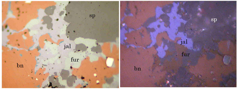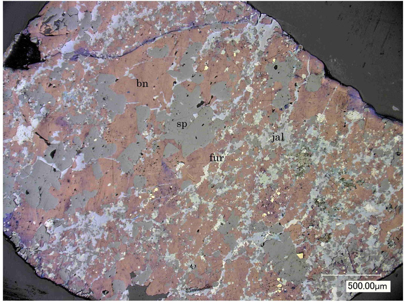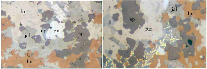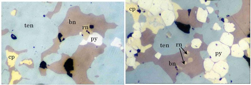 写真略号:py:黄鉄鉱、cp:黄銅鉱、gn:方鉛鉱、sp:閃亜鉛鉱、ten:四面砒銅鉱、rn:レニエル鉱、fualr:古遠部鉱、jal:輝銀銅鉱、el:エレクトラム、dg:方輝銅鉱。