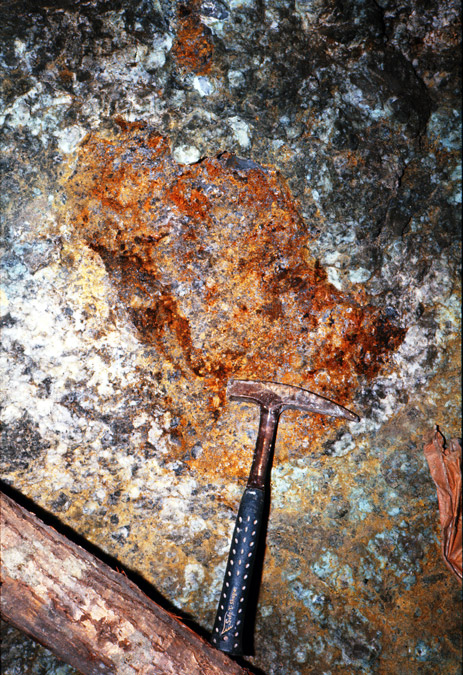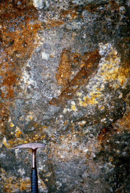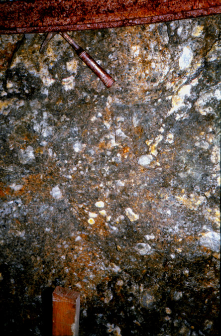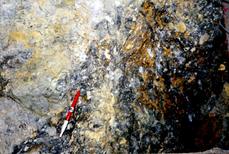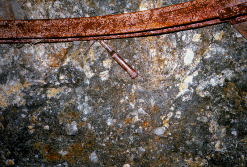 元山鉱床の露天掘り跡の一部に賞規模ながら黒鉱が露出している場所があり、黒鉱の胚胎状況が観察できる場所が見られる。