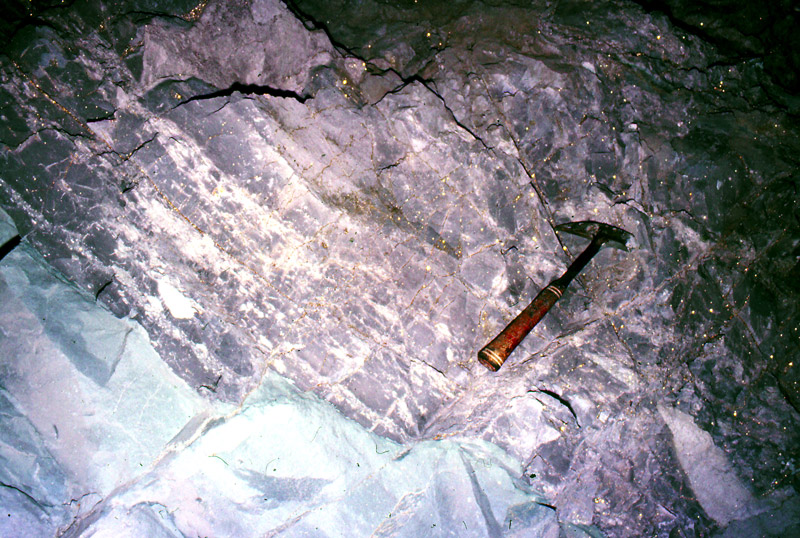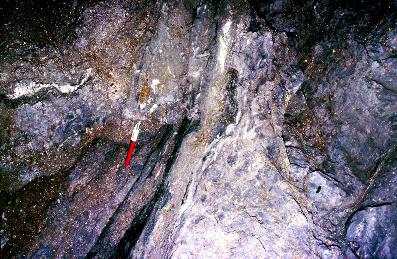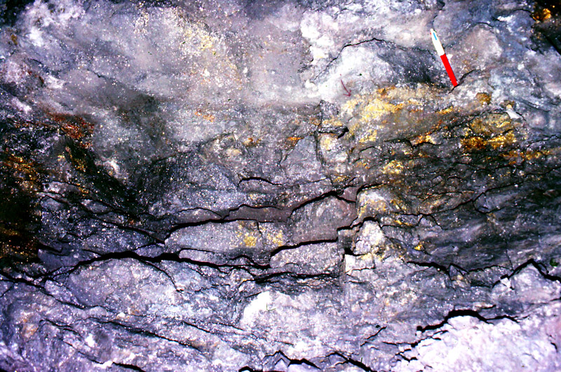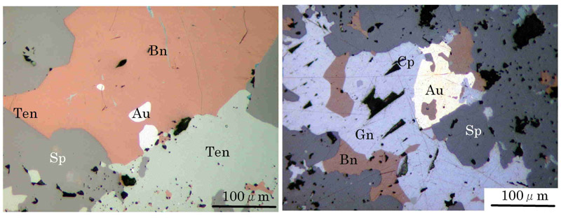 第11鉱体黒鉱の最上部における斑銅鉱や方鉛鉱に随伴する自然金。