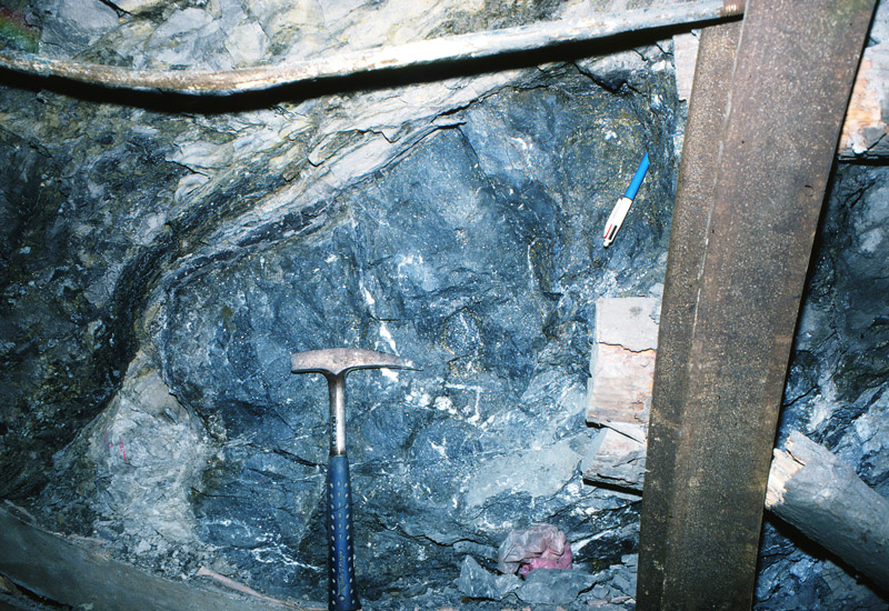 第11鉱体上部斑銅鉱質黒鉱中に産出し、方鉛鉱、斑銅鉱や方輝銅鉱と