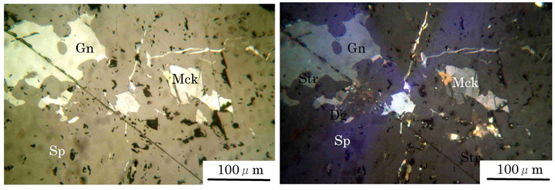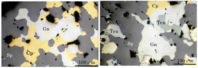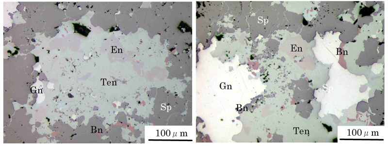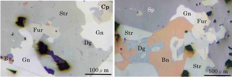 略号:Cp:黄銅鉱、Gn:方鉛鉱、Bn:斑銅鉱、Py:黄鉄鉱、Ten:四面砒銅鉱、 En:硫砒銅鉱、Dg:方輝銅鉱(Digenite)、Str:輝銀銅鉱(Stromeyerite)、 Mck:マッキンストリー鉱(Mackinstryite)、Fur:古遠部鉱(Furutobeite)。これらの鉱物の化学式に関しては本HP【展示鉱石】の【元素別鉱石】の(金銀鉱)、(銅鉱)および(鉛・亜鉛鉱)の項目を参照下さい。