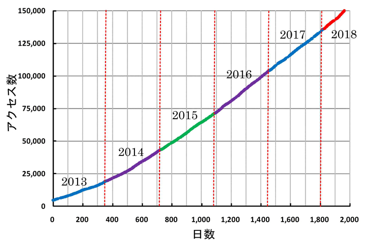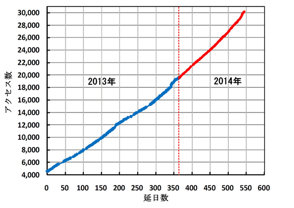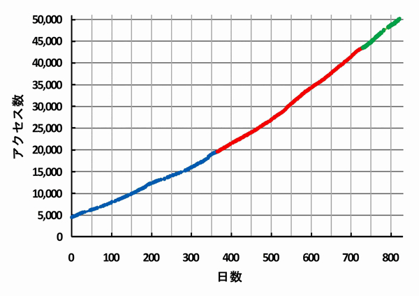 2013年1月1日からのアクセス数の推移は右図の様です。約2.2年で5万件を超えたことになります。前回報告した3万件(2014年7月1日)から約9ヶ月で2万件増加したことになります。