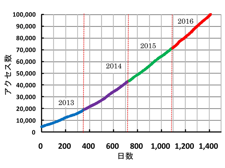 2013年1月1日からのアクセス数の推移は右図の様です。約3年で7万5千件を超えたことになります。前回報告した5万件(2015年4月6日)から約8.5ヶ月で,2万5千件増加しています。今年に入ってのアクセス数は1日約85件程度で,次第に増加傾向にあります。この傾向が持続すれば本年中には10万件に達すると思われます。ご覧頂いた皆様に感謝申し上げます。