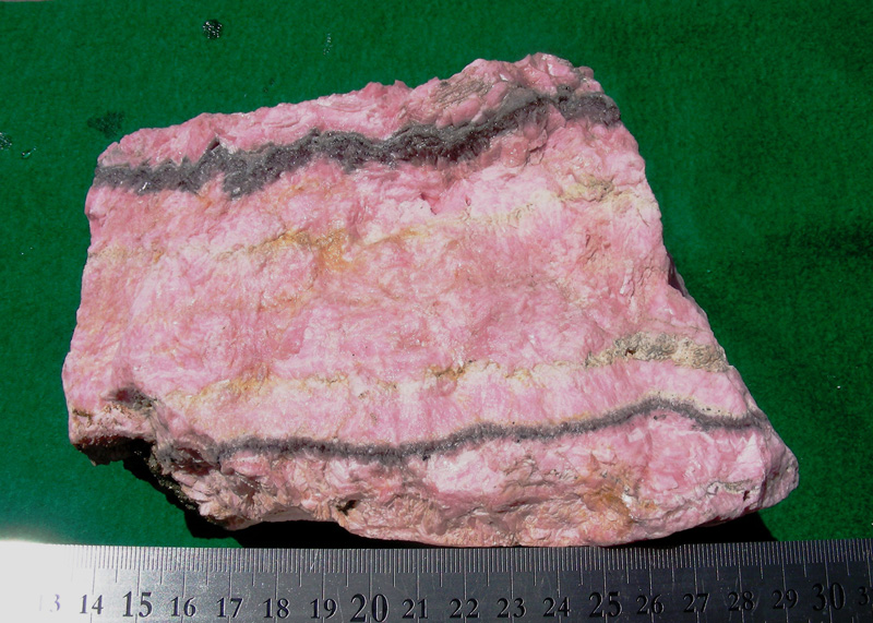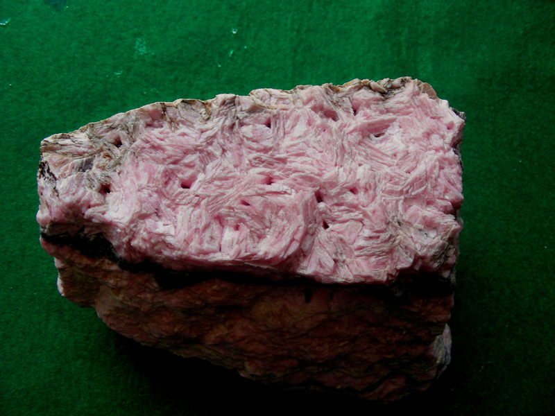 この鉱石は採取時には菱マンガン鉱はピンク色で“桜マンガン”と言われた鉱石でしたが、採取後長時間空気中で保存しており、表面が黒灰色に変化した鉱石でしたが、錆取り処理後ほぼ採取した時の色に戻りました。現在のサンプルの色は下図のようなピンク色で、脈中央部には菱面対を呈する自形結晶が密集しています。
