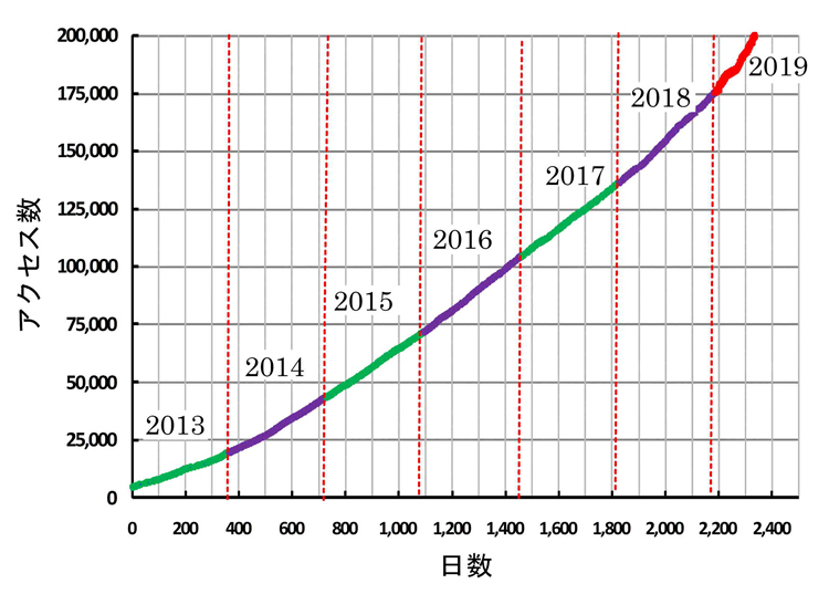 2013年1月1日からのアクセス数は右図のようです。約7年8ヶ月で25万件を超えたことになります。前回報告した20万件(2019年7月20日)から約1.15年で5万件増加しております。現在展示館のアクセス数は1日平均122件程度で、1日のアクセス数は次第に増加傾向にあります。ご覧頂いた皆様に感謝申し上げます。また、ご意見、不明な箇所あるいはミスなどお気づきの点がございましたら、「お問い合わせ」先までにお知らせ下さい。