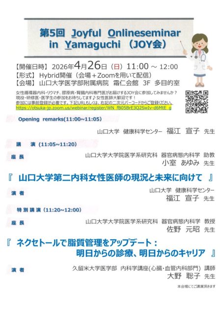 福江 宣子 先生(健康科学センター)が、「山口大学第二内科女性医師の現況と未来に向けて」と題してお話しします。 「ぶっちゃけ、ワークライフバランスってどうなの?」という気になる疑問。二内科がいかに多様な働き方をサポートしているか、その雰囲気を感じ取ってください。