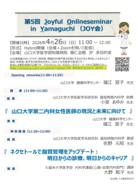 2026年4月26日(日)、山口大学医学部附属病院 霜仁会館およびオンラインのハイブリッド形式にて、「第5回 JOY会(Joyful Onlineseminar in Yamaguchi)」を開催いたしました。