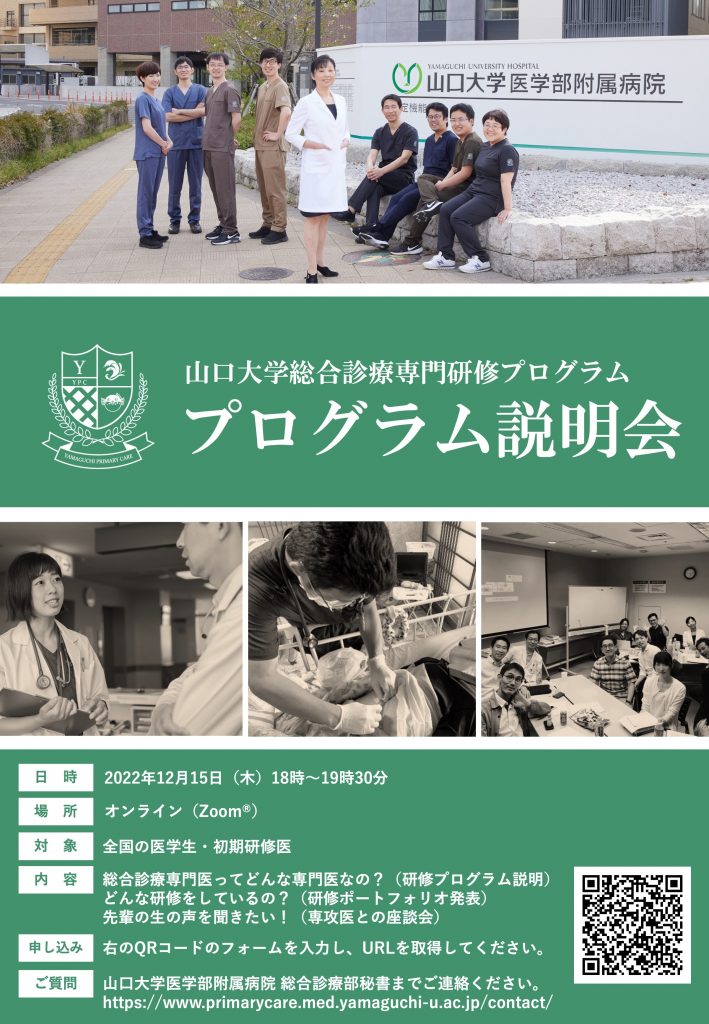 この度、山口大学総合診療専門研修プログラムのプログラム説明会(医局説明会)を開催することになりました。 アットホームな会ですので、総合診療専門医にちょっとでも興味のある方は、是非ともご参加ください。