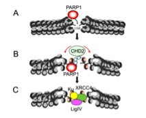 二本鎖切断の際の非相同末端結合(NHEJ)による修復機構を例として示す。まず,PARP1が損傷を認識し,最初に損傷DNA部位に集積する(A)。PARP1に続いてクロマチン再構成因子CHD2(B),さらにDNA修復因子群(C)がリクルートされることで,最終的にDNA損傷が修復される。(Luijsterburg et al, Mol. Cellを改変)