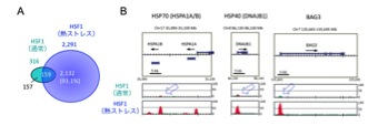 一方、細胞にはタンパク質の異常に対処するための適応機構も備えており、進化的にも保存されたものの一つが熱ショック応答と呼ばれる転写誘導機構です。それを調節する鍵因子が熱ショック転写因子1(HSF1)(注3)です。HSF1は温熱ストレス条件下などでタンパク質の異常が生じると,それを修復する遺伝子の上流に結合して転写を誘導します。最近,HSF1があらかじめ染色体DNAのあらゆる部位に結合することが示されてきましたが(図2),その意義は十分には解明されていませんでした。