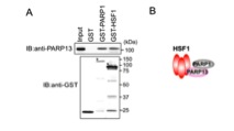 (A)PARP13,GSTと融合したPARP1,GSTと融合したHSF1を精製し,GST-pull down 法により直接的な相互作用を調べた。PARP13は精製GST-PARP1および精製GST-HSF1とともに沈降する。(B)三者複合体の模式図。HSF1は三量体を形成してDNAへ結合出来るが,同時にPARP13を介してPARP1とも相互作用する。