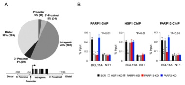(A)ChIP-seq法によりヒトHeLa細胞における744のPARP1結合部位を同定し,それらが遺伝子のどの領域かを示した。PARP13を欠くと,この中でわずか10のPARP1結合部位が残る(データは示さない)。(B)BCL11A遺伝子座に焦点を当てて,PARP1、HSF1、PARP13の結合をChIP法で調べた。HSF1あるいはPARP13をノックダウン(HSF1-KD, PARP13-KD)するとPARP1の結合が失われる。以上の結果は,三者複合体がHSF1を介して染色体の全体にわたり結合していることを示唆する。星印はt検定によって有意差があることを示す。