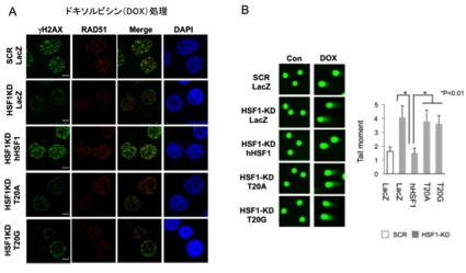 (A)細胞をDNA損傷薬剤(ドキソルビシン,DOX)で処理すると修復シグナルであるγH2AX染色が増強し,修復因子RAD51が染色体へ集積する(1列目)。 HSF1を欠損するとそれらが減弱する(2列目)。そこで,野生型HSF1を戻すとγH2AX染色の増強,修復因子RAD51の集積を認めるが(3列目),変異型HSF1(T20A, T20G)を戻しても認めない(4,5列目)。(B)コメットアッセイ法によってDNA損傷の程度を調べた。細胞にドキソルビシン(DOX)を処理するとDNA損傷が蓄積するが,HSF1欠損(HSF1-KD)によってより顕著となる。野生型HSF1(HSF1)を発現させるとDNA損傷はもとのレベルまで低下するが,変異体HSF1(H20A, T20G)を発現させても高いままである。