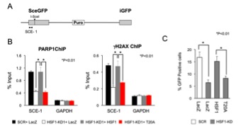 (A)二本鎖DNA損傷の際の相同組換え修復(HRR)をモニターするためのレポーター遺伝子の構造を示す。SceGFPとiGFPはともに蛍光タンパク質GFPの一部を持つ不完全なものである。制限酵素I-SceIでSceGFP遺伝子の一部を切断すると,HRRにより完全なGFPが出来る。(B)PARP1の切断部位近傍(SCE-1)への集積をChIPアッセイ法で調べた。変異HSF1(T20A)を発現する細胞では集積が減少した(赤)。(C)相同組換え修復の効率をGFPの蛍光を発する細胞の数として定量した。変異HSF1(T20A)を発現する細胞ではHRRの効率が低い。