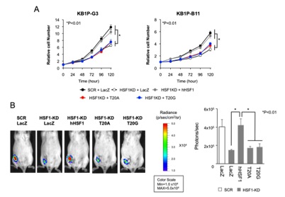 (A)BRCA1遺伝子を欠損するマウス乳がん細胞(KB1P-G3, KB1P-B11)の細胞増殖を調べた。HSF1を欠損する(HSF1KD),あるいは三者複合体を形成できない変異HSF1(T20A, T20G)を発現するがん細胞の増殖は低下した。星印はANOVA検定によって有意差があることを示す。(B)KB1P-G3細胞のマウス乳腺近傍での腫瘍形成を生体イメージングシステム(IVIS)調べた。三者複合体を形成できない変異HSF1(T20A, T20G)を発現する細胞のマウスでの腫瘍形成は顕著に低下した。