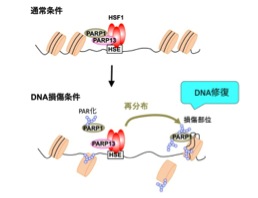 通常条件下では,染色体DNAに結合するHSF1がPARP13を介してPARP1をあらかじめ全染色体上に留めておく。DNA損傷によりPARP1がPAR化活性を獲得し,自らをPARP化することで解離し,DNA損傷部位へ再分布する。あらかじめ三者複合体を作ることが,PARP1のDNA損傷部位への集積に必要である。PARP1は、DNA修復因子群をひき寄せることで修復を促進する。