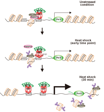 今回、私たちは、HSP70の熱ストレス時の転写誘導に焦点を当てて、この複合体の役割を明らかにしました。非ストレス条件下で、HSF1-PARP13-PARP1はHSP70プロモーターに結合していました(図1)。熱ストレス条件下では、PARP1は自己PAR化により複合体から解離し、最初はプロモーター領域、その後遺伝子コード領域へと移動することが分りました。その結果、HSF1のプロモーターへの急速で顕著な結合が促進され、HSP70の転写誘導とプロテオスタシス容量の増加が亢進されることが分りました。HSF1-S121のリン酸化によるPARP13の解離もこの一連の過程を促進しました(図1)。さらに、HSF1-PARP13-PARP1はDNA損傷ストレスによって解離するため、あらかじめDNA損傷ストレスに曝されると、熱ショック応答が減弱することも分りました。