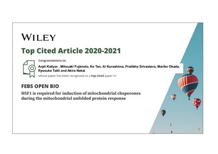 本論文では、ミトコンドリア不良タンパク質応答(UPRmt)の際に熱ショック転写因子HSF1ががミトコンドリアシャペロンの誘導に必須であることを明らかにし、ミトコンドリア機能を保護することを示唆しました。FEBS Open Bio 誌に掲載された論文の中で、2020から2021までの2年間でもっとも引用されたものとして選ばれました。
